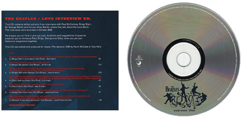 Apple/EMI was obviously determined to give “Love” the full promotional and marketing treatment because they also pressed and distributed (in limited numbers) a special “Interview Disc” featuring Paul McCartney, Ringo Starr and George and Giles Martin in conversation about “Love”. The interviews were recorded in October 2006, and they are all stand-alone statements about dirrent aspects of the work that went into producing “Love”, and the running order works through the release track-by-track. Its an interesting historical artifact to have in the collection. And definitely an authentic, original release. As you can see, again it has a colour variation of the “Love” artwork common to all releases: