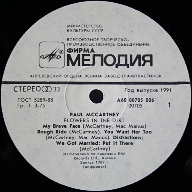 There is one other in my collection. Its Paul McCartney – “Flowers in the Dirt” (1989). This is on the white Melodiya label and has a plastic inner bag: