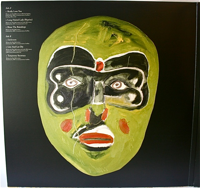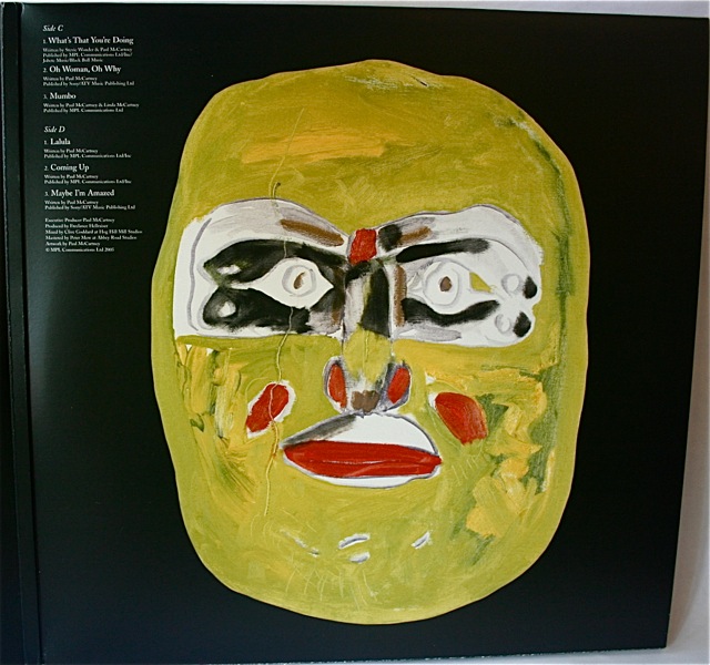 The LP (on Parlophone Records) comes in a nice thick cardboard gate-fold cover. The images above are from inside the gate-fold and show more McCartney-painted faces and a track-listing (with writer’s credits) for each record. The labels on each of the LPs are custom-designed with one side having the track-listing for both sides, and the other a painted face: