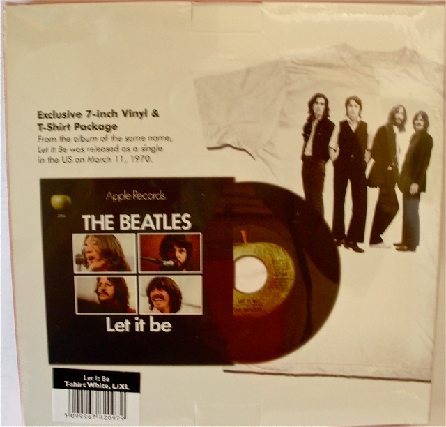 All the vinyl singles have Capitol Records labels, except for “Let It Be” which is on the Apple Records label – just as it would have been back in 1970 when it first came out. The singles look like the original issues except that Sony/ATV is listed as the music publisher. The picture sleeves are in a thicker cardboard than the paper ones that were originally were issued. The contents of each box, deatiling the cover, the labels, and the enclosed t-shirt design are pictured on the rear of each package: