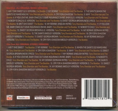 Writing a review on the Amazon site, kennedy19 summed it up this way (and the same can be said for this Time-Life 50th anniversary edition: “….the 1961-62 recordings of the Beatles (with Pete Best, not yet Ringo) in recording studios in Germany as a backup band for Liverpool singer Tony Sheridan. The Beatles themselves had nothing to do with this reissue, but Beatlemaniacs will be impressed with the thoroughness with which this collection was made….The recordings themselves are contained on 2 CDs, and it should be noted that there are really only about 10 songs here, but that this set excels in tracking down every available mix of each one that was ever released (the original tapes no longer exist), both in mono and stereo. Beatles fans may be disappointed that Sheridan (impersonating Elvis pretty well) sang most of the lead vocals on these recordings, although John Lennon does get to sing a version of “Ain’t She Sweet,” and the Beatles did get to record their own catchy instrumental composition, “Cry for a Shadow.” Other songs include “When the Saints Go Marching In” and the famous “My Bonnie” which brought the band to Brian Epstein’s attention. It is interesting to hear the Beatles playing their recognizable sound here, with the energy and versatility that would amaze the world in a few short years. This is also a rare chance to assess the drumming of Pete Best. Casual fans will think this set, with its multiple versions of the same songs, and its painstaking documentation of each one, to be too much ado about too little. But scholars and rabid fans interested in the early years of the group will definitely want to add this to their collection. And yes, the sound quality is very good.”