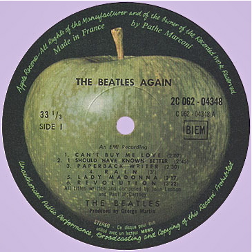 Next is a French Apple pressing of the 1970 Beatle compilation release, “The Beatles Again” (or in some markets known as “Hey Jude”). The rear cover and labels for this one are unique to France with their prominent references to the disc manufacturer Pathe Marconi: