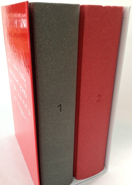 The books themselves are great. Very understated, but oozing quality and all the hallmarks of the bookmakers art. Lewisohn’s website says that they’re printed on New Langely Antique Wove woodfree paper, with red-and-white head and tail bands and red ribbon marker. The covers are very textured, deeply embossed and look good. One comes in dark grey, the other in red: