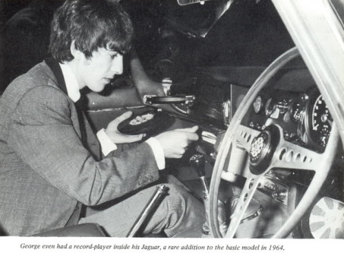 In the Beatles with Records Part 15 we showed this photo of George from 1964, loading singles into the then very groovy in-dash record player in his E-Type Jaguar: