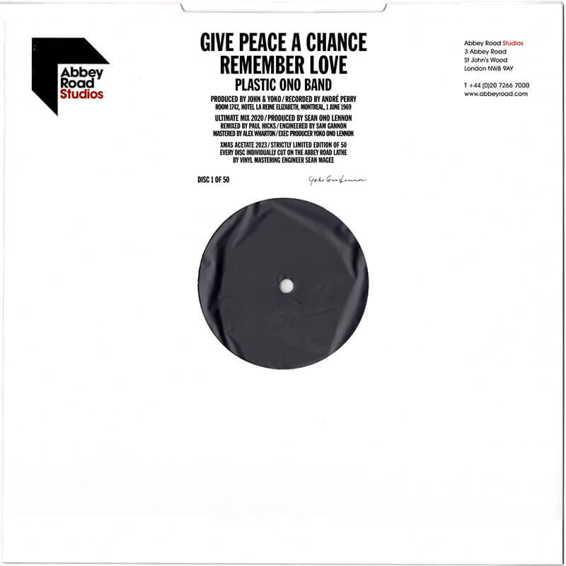The pair, in association with Abbey Road Studios and Universal Music, commissioned 50 rare and strictly limited 12″ vinyl acetates of the Ultimate Mixes of the Plastic Ono Band single ‘Give Peace A Chance’/’Remember Love’.