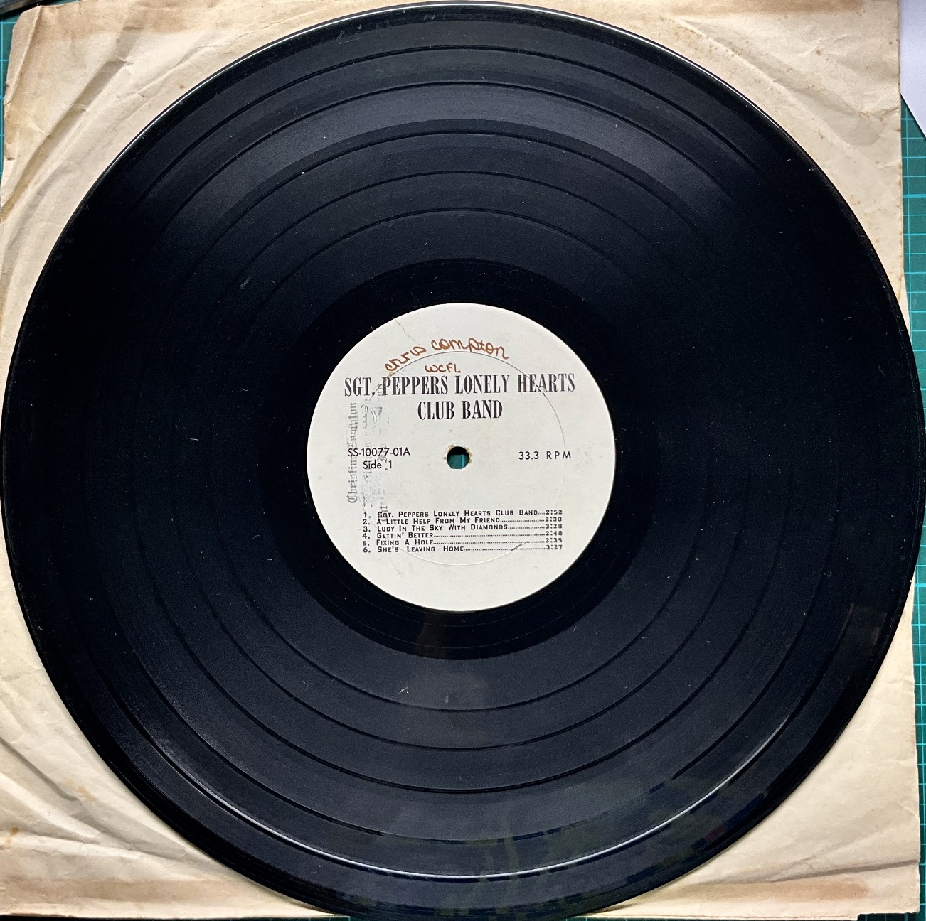They write: “I have a radio station promo copy of Sgt. Pepper I won from them in a contest in 1967. Black/white label, songs in a different order from the released album. Etched serial numbers are SS10077-01A and SS10077-01B. Have you any suggestions for getting it appraised?”