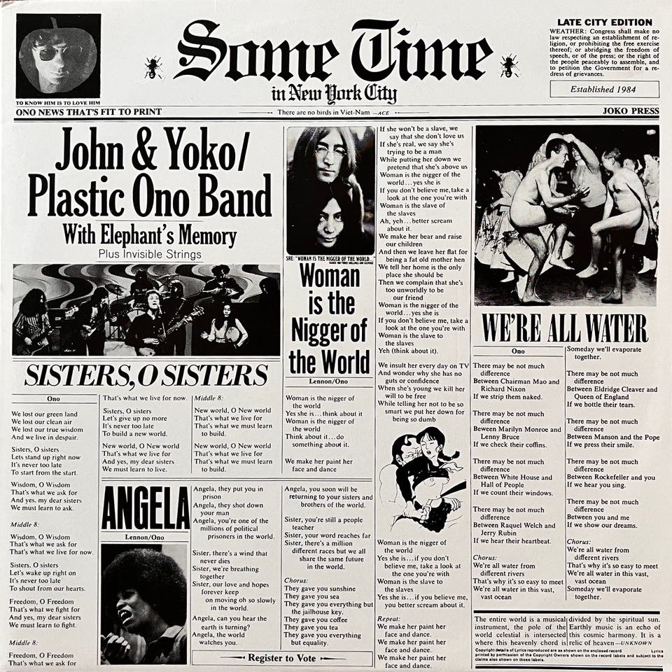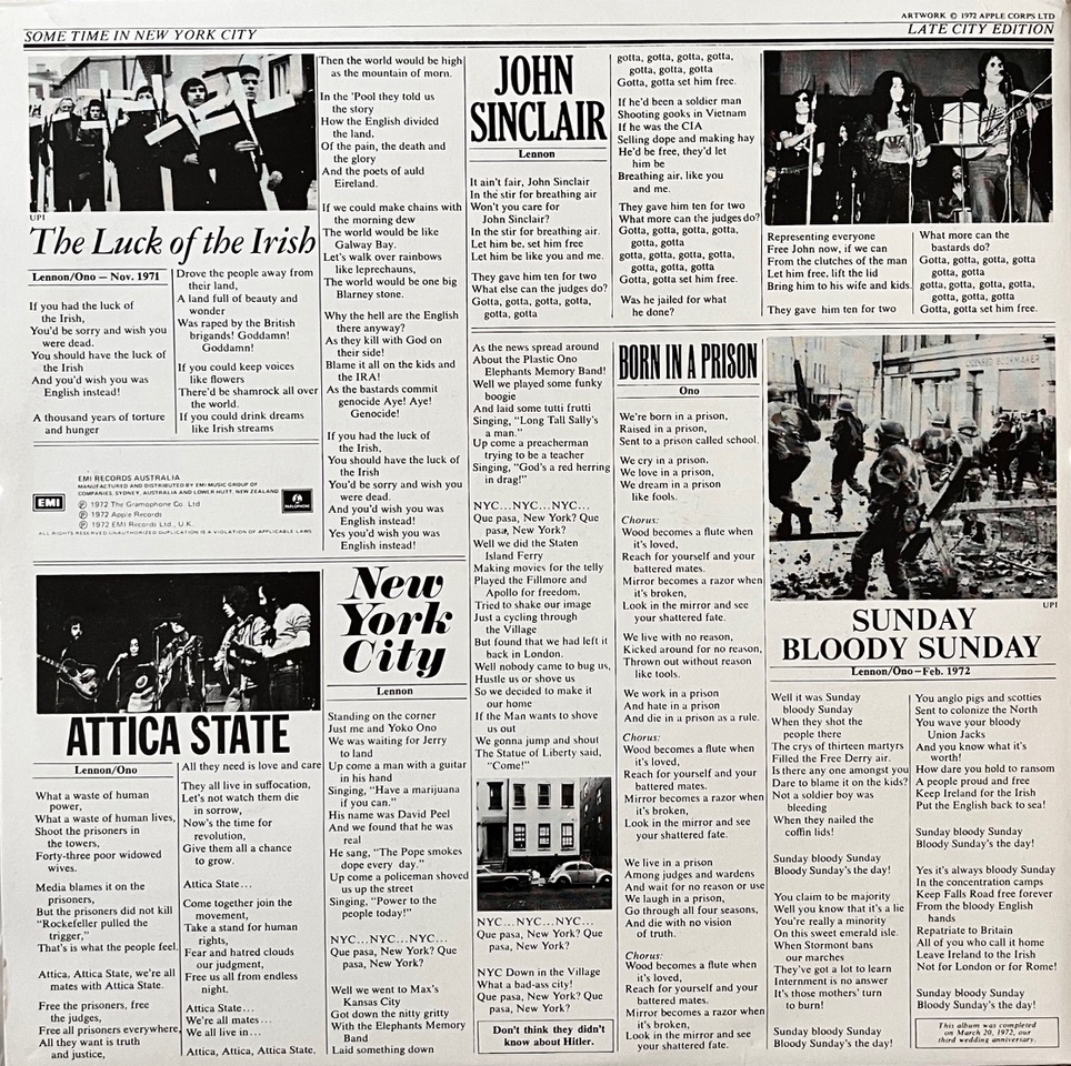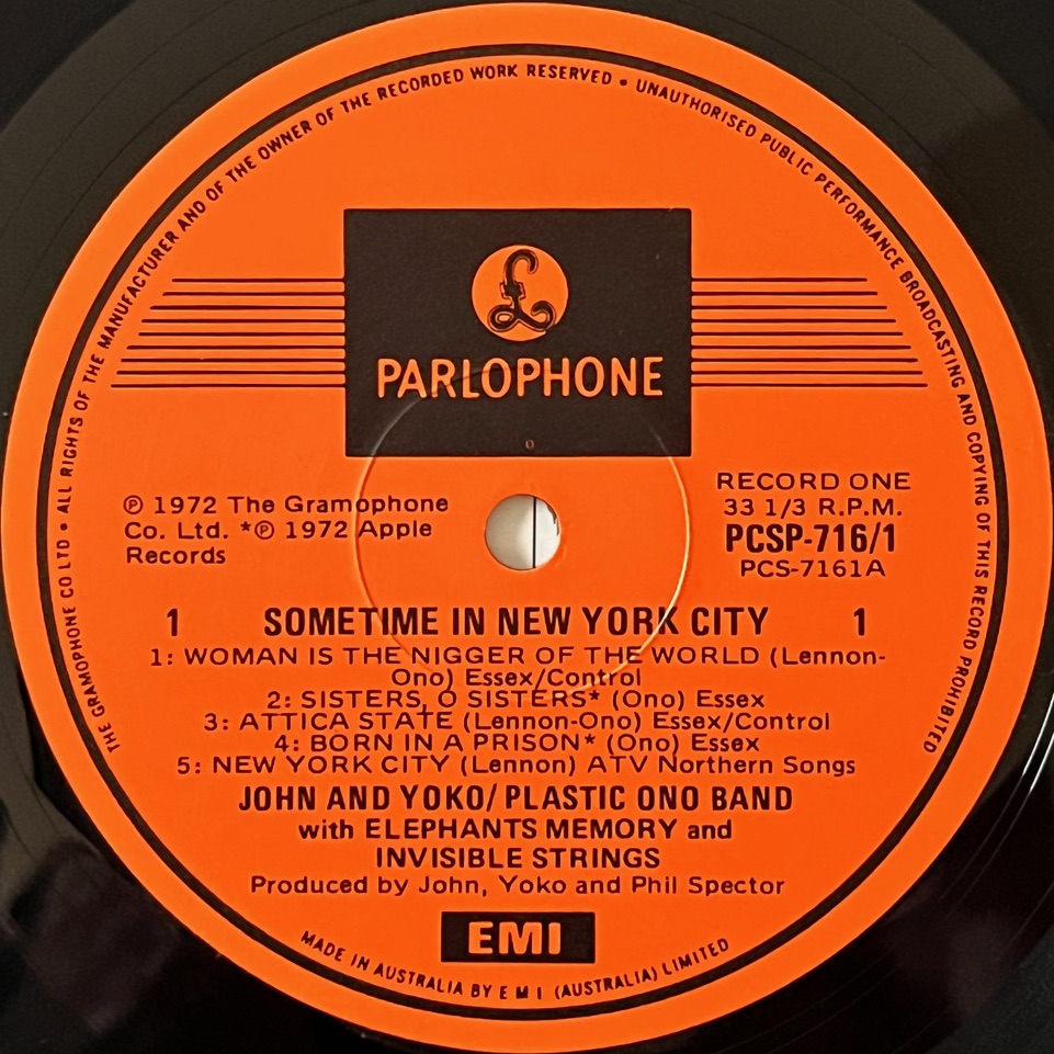 With last year’s focus on the Lennon Estate’s big box set Power to the People, this album (minus one controversial song) was it’s centrepiece, along with the One To One concerts and a wealth of previously unreleased Lennon and Ono outtakes and rarities. So it was timely to find an unusual Australian vinyl pressing from 1981 of the original Some Time In New York City album to add to our collection.