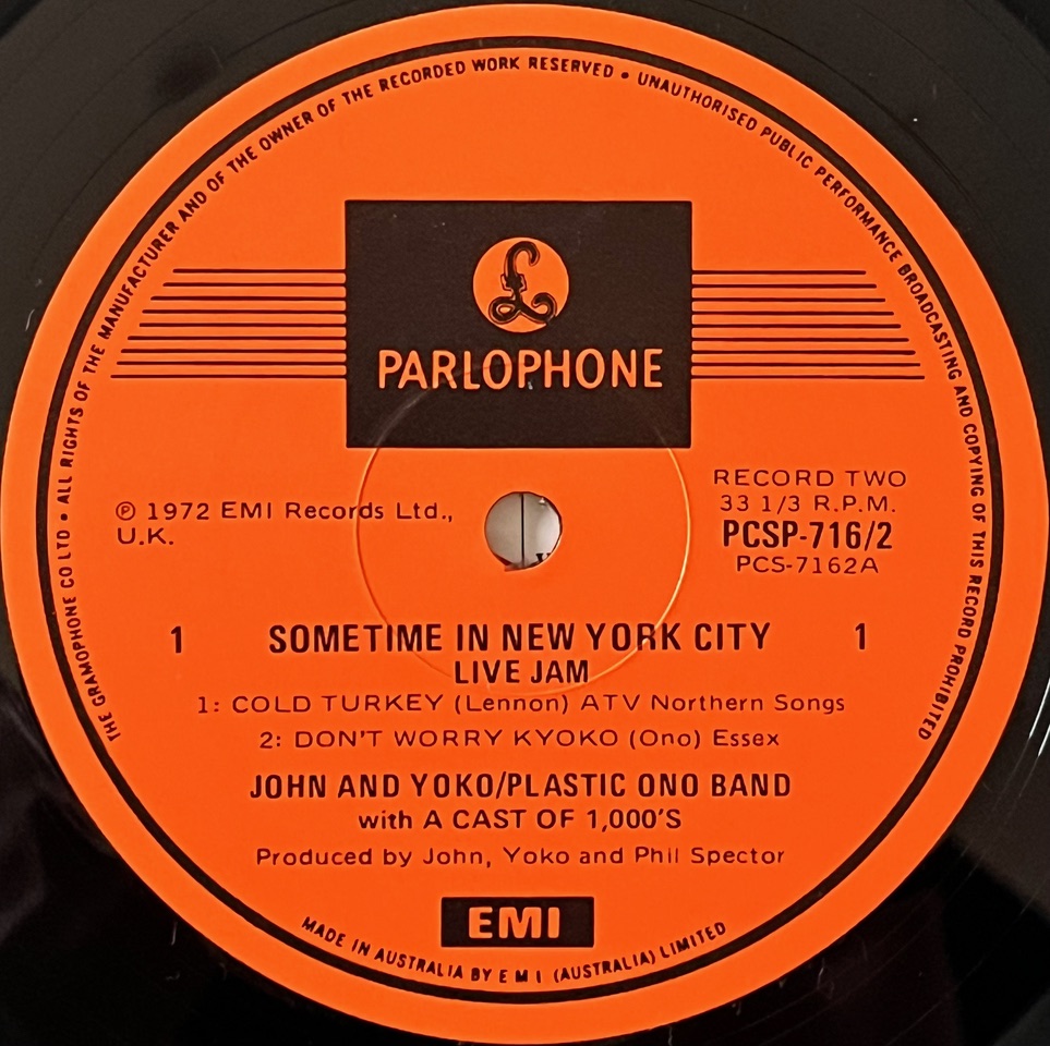 With last year’s focus on the Lennon Estate’s big box set Power to the People, this album (minus one controversial song) was it’s centrepiece, along with the One To One concerts and a wealth of previously unreleased Lennon and Ono outtakes and rarities. So it was timely to find an unusual Australian vinyl pressing from 1981 of the original Some Time In New York City album to add to our collection.