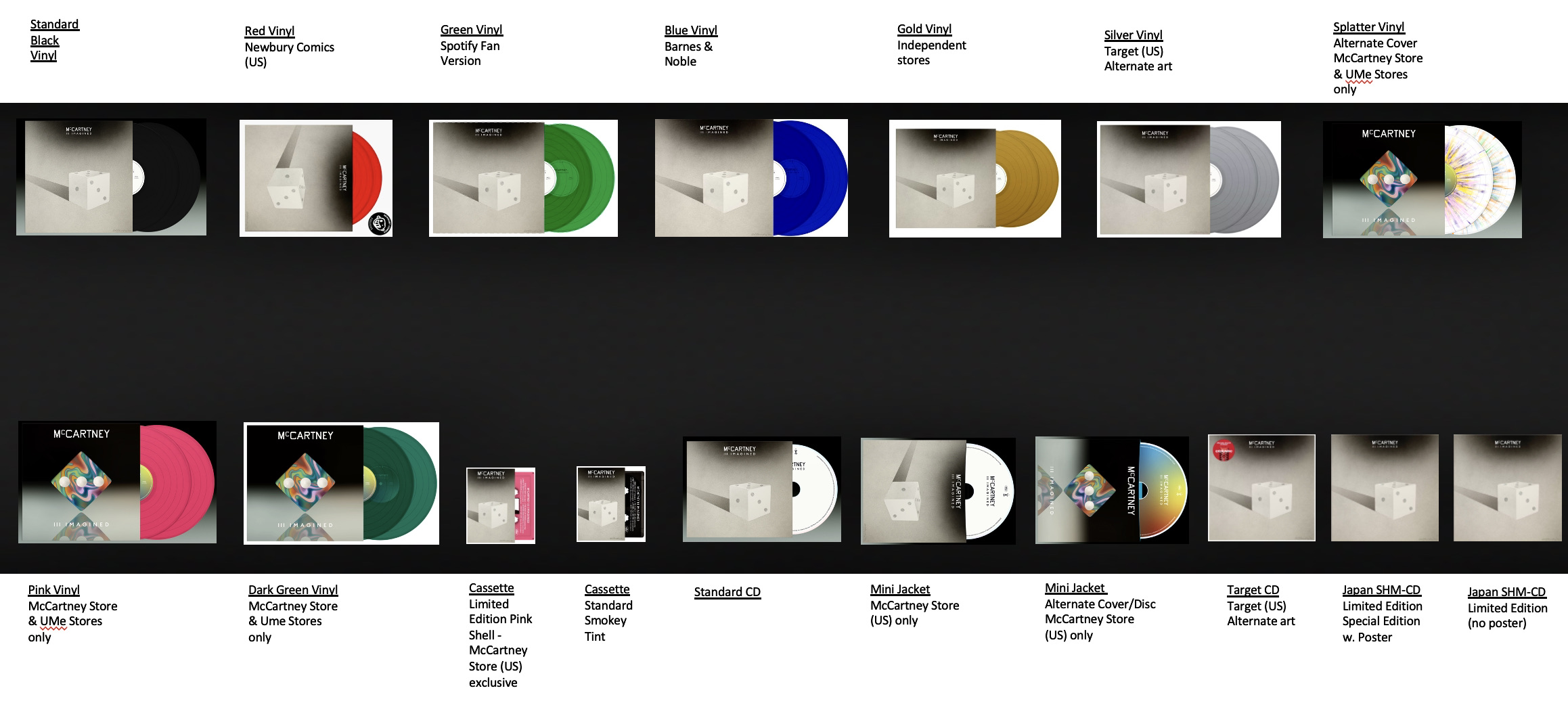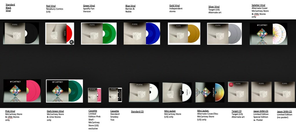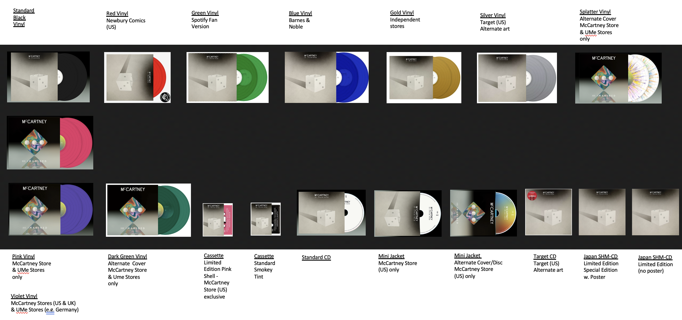 Here’s a chart showing all the release variations of McCartney III Imagined so far (as usual, click on the images to see larger versions):