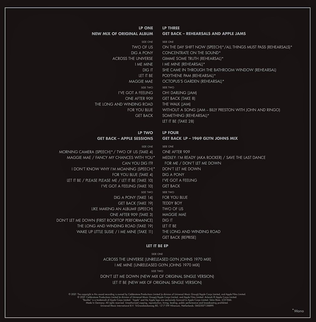 Both these total 57 tracks in all: the original Let It Be LP in a new stereo mix by Giles Martin and Sam Okell, two discs of previously unreleased outtakes, studio jams and rehearsals, and the previously unreleased 1969 Get Back LP mix by Glyn Johns, newly remastered. Then there’s that Let It Be EP (in both the vinyl and CD boxes) as a separate disc containing 4 tracks: o Glyn Johns’ unreleased 1970 mixes of ‘Across The Universe’ and ‘I Me Mine’. o Giles Martin & Sam Okell’s new stereo mixes of the ‘Don’t Let Me Down’ and ‘Let It Be’ singles.