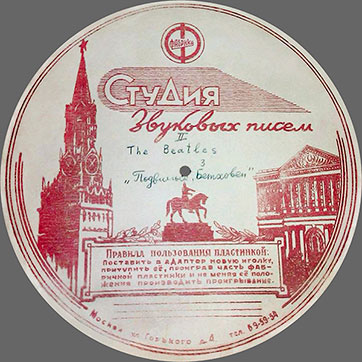 Using smuggled-in originals from England and Europe, they made their own un-official copies of songs the only ways they knew how. This was done using two main processes. The first was to utilise the many small, commercial recording booths that were dotted around Russian cities and towns. These were set up to record short audio ‘postcards’ that could be sent through the post. This was, back in the day, a popular way of sending loved ones a message along with a photograph of the place or holiday location you’d been visiting. They looked something like this:The postcard/record above is like a one-sided flexidisc, with the “message” recorded onto the picture side. But this particular example contains a recording of ‘Roll Over Beethoven’! These ‘postcard’ flexies played at 78rpm and only conatined enough space for one song. Also, the quality wasn’t great – but, you got to hear The Beatles in a country that didn’t allow you to freely listen to them.