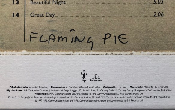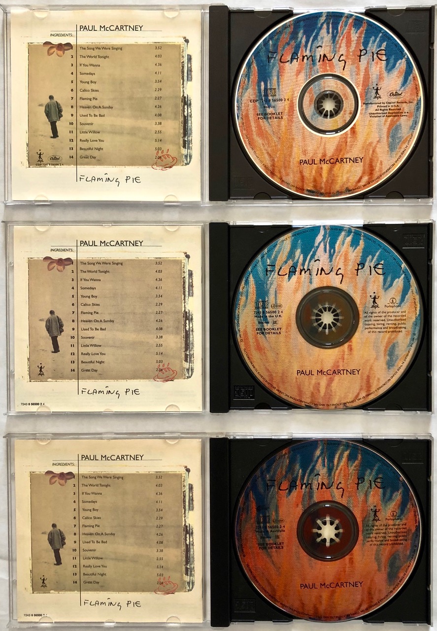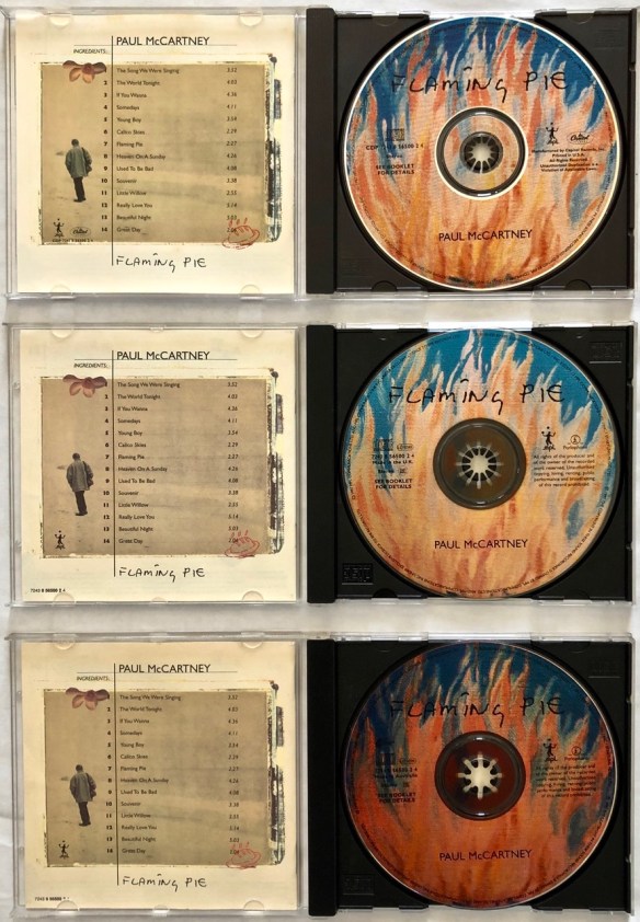 In our collection we have three versions of the original 1997 CD release of Flaming Pie. These come from, in descending order in the photos, the USA, UK and Australia: