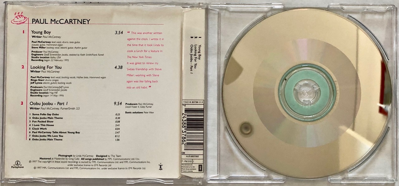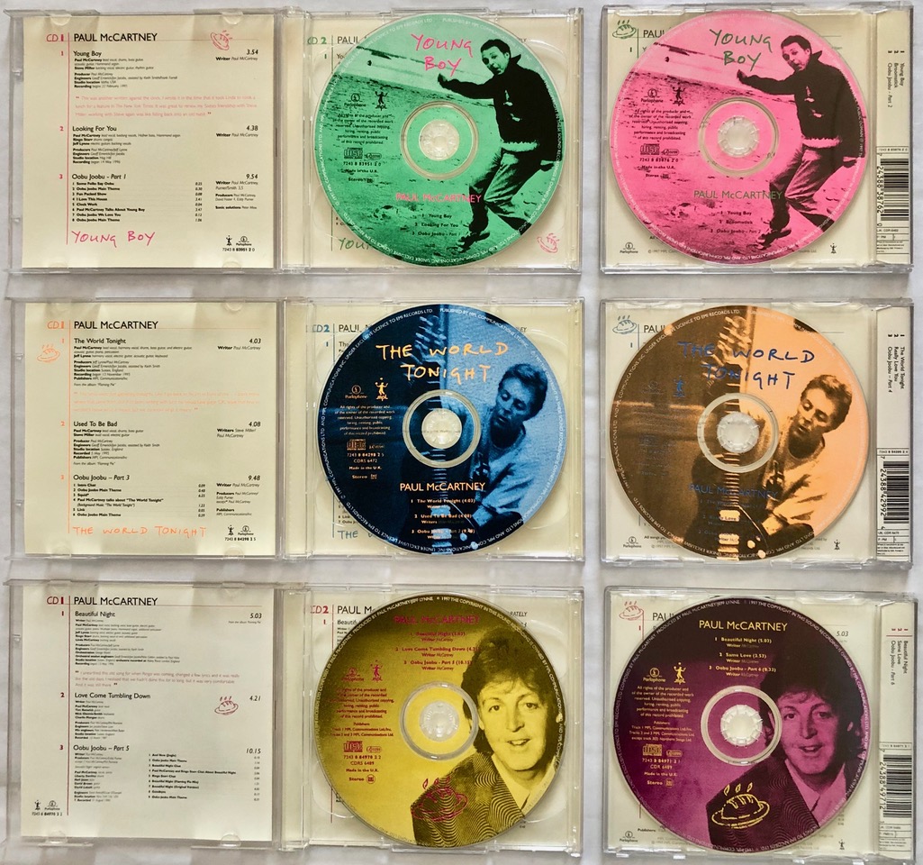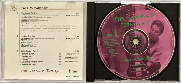 In the US, the only CD single was ‘The World Tonight’. It came in a proper CD jewel case and has the non-LP bonus track ‘Looking For You’, plus a track called ‘Ooobu Joobu – Part 1’. This is an extract from a radio show of the same name broadcast on the American radio network Westwood One. It was hosted by Paul McCartney and contained demos, rehearsals, live performances, unreleased recordings and chat. There were six such extracts contained on the UK CD singles (more on this below), but the US only got one of them: