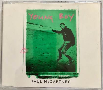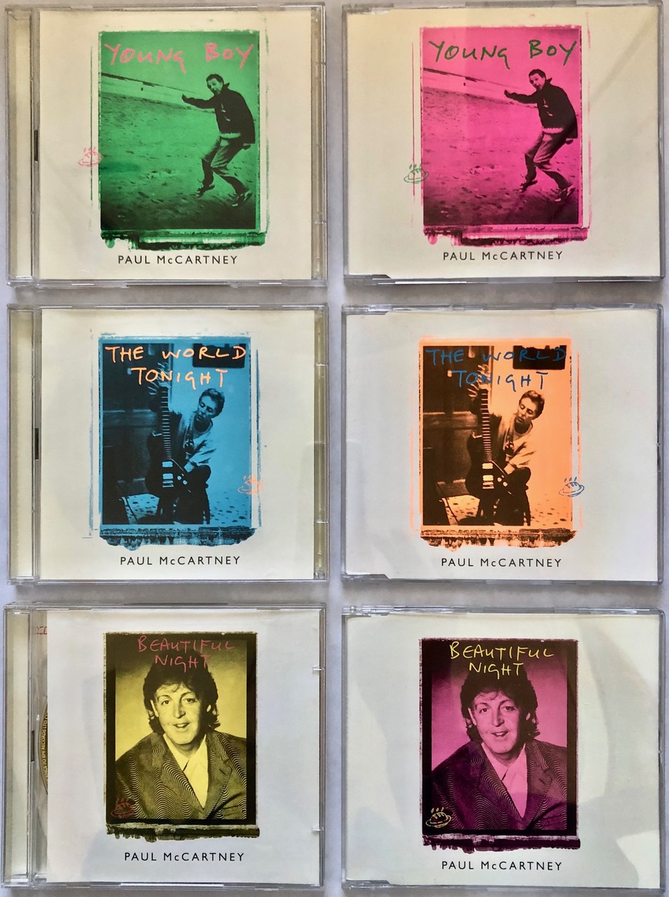 The real bonanza was the UK CD singles. Like the vinyl picture discs above there were three songs released – ‘Young Boy’, ‘The World Tonight’ and ‘Beautiful Night’. Each CD single had two additional tracks plus, available separately, were three more companion CD singles. Each also contains either ‘Young Boy’, ‘The World Tonight’ or ‘Beautiful Night’, plus an additional one or two “rarity” non-LP offerings. The main (or Part 1) CD single is in a full size jewel case, the companion (or Part 2) CD single is in a slimline CD case: