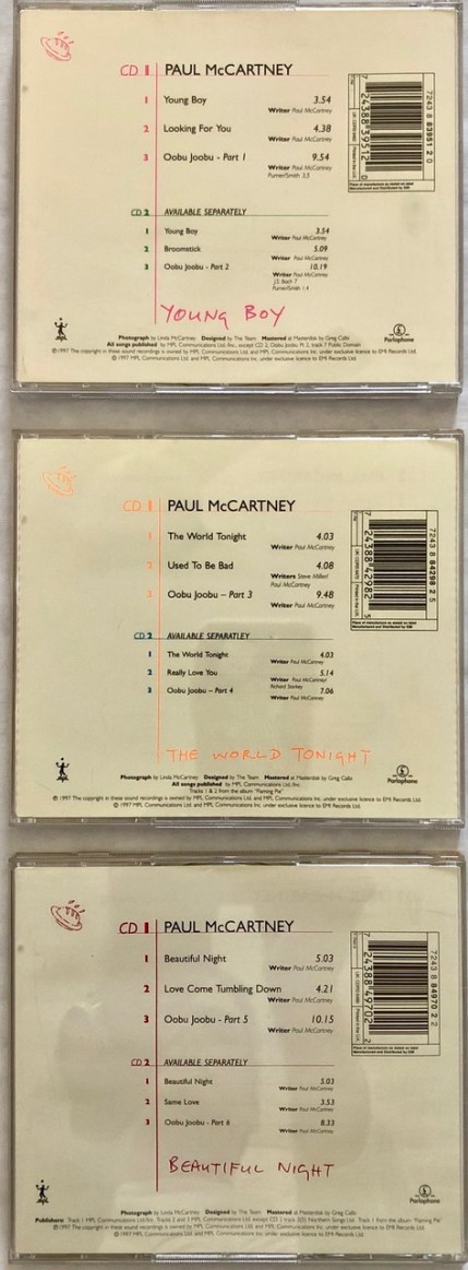 The new Flaming Pie Collectors Edition, Deluxe box set, and the 2CD set will each contain the four non-LP songs, but it seems the ‘Oobu Joobu’ content (found only on the Collectors Edition and Deluxe box sets) will be different edits to the originals because they are all quite a bit shorter in duration.