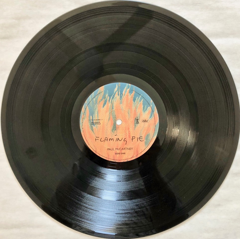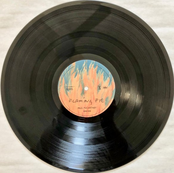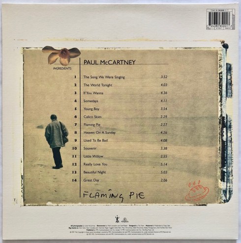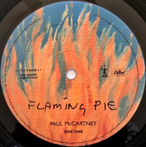First up, the original vinyl editions of Flaming Pie from 1997. Unlike the forthcoming re-issues, this is a single LP. These are now fairly rare and fetch high prices on the second-hand market. Discogs, for example, has the sales history of UK pressings and it ranges from around US$100.00 to US$280.00. Here’s the UK press and, as usual, click on any of the images to see larger versions: