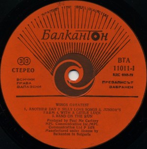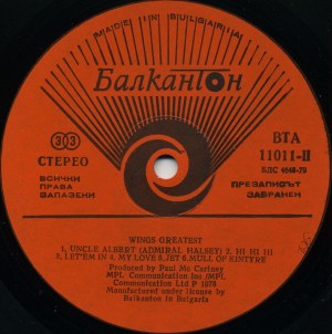 This copy of Wings Greatest is not only distinguished by its unusual labels (see below), but also the fact that it comes with one less song than every version we can find released anywhere else in the world. You can see that Side 1 is missing the track ‘Live and Let Die’. In every other market Side 1 has six tracks. In Bulgaria they got just five:Just to refresh your memory, here’s the US Capitol version of this 1978 compilation LP: