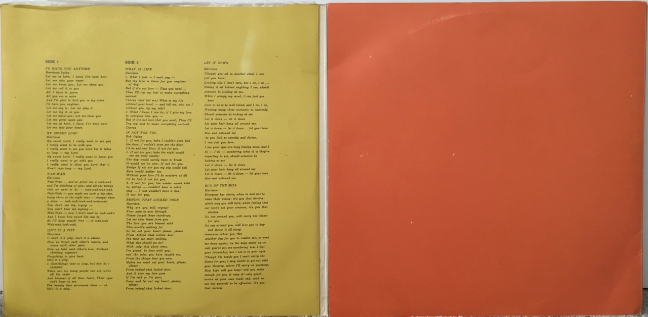 Nowhere, either on the cover or on the labels, is a place of manufacture stated – making it something of a mystery. Also, if there was ever one of the large George Harrison posters which came with this release in other markets, it is long gone. None to be found.