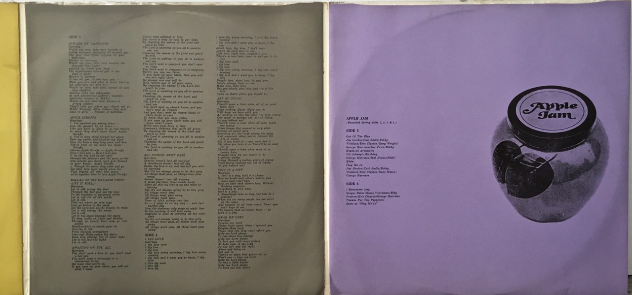 Open the out the second of the gatefolds and this is what the right hand side looks like – with lyrics for the songs on Sides 3 and 4 printed on the centre, grey coloured panel. The mauve (or lilac) coloured panel on the right has the song titles and details of who plays in the Apple Jam tracks on Sides 5 and 6, plus a large “Apple Jam” logo: