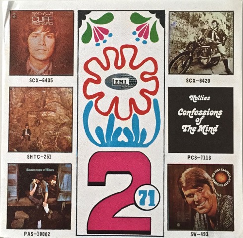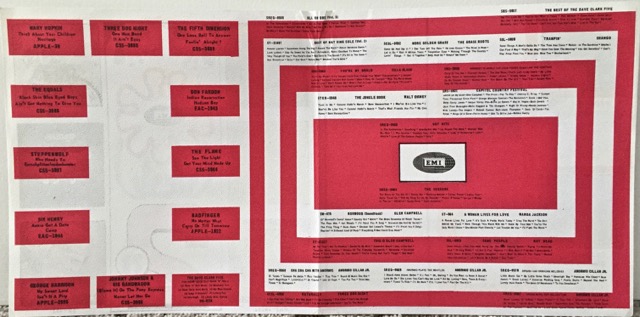 While fishing around in the sleeves just now out fell what looks like an official EMI flyer advertising other releases available from the company for the year 1971. We hadn’t noticed this before. It’s small (about 7″x7″), and has four pages.