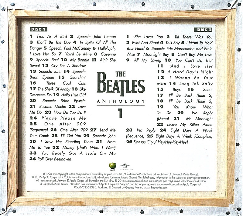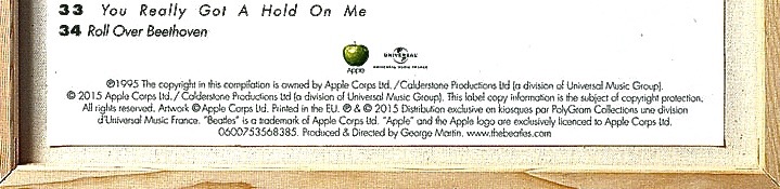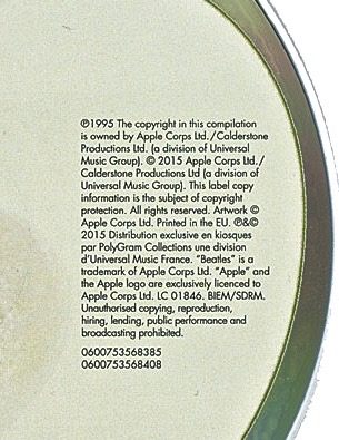 All these French reissues are in fact unique. They have different catalogue numbers and copyright details on the rear covers, and on their printed labels. For example, here’s the Anthology 1 CD. You can see reference to the Beatles Calderstone Productions Ltd., and even the fact that they are to be sold exclusively at newsagent kiosks:
