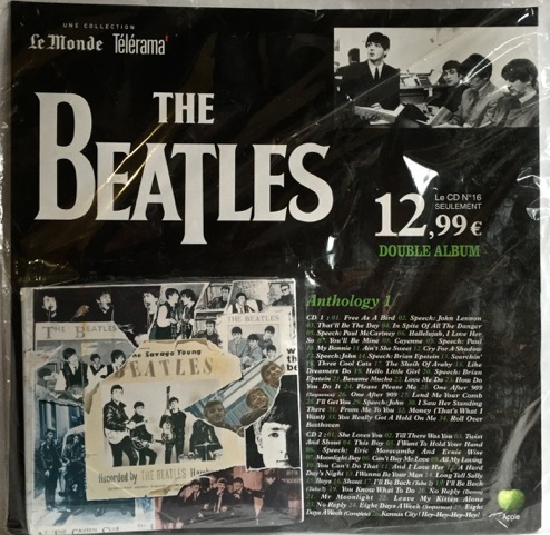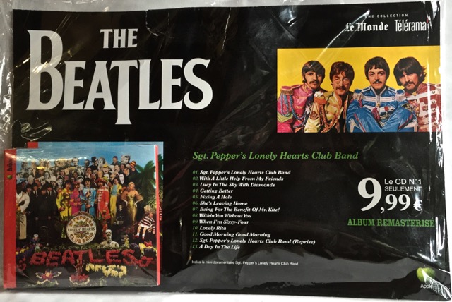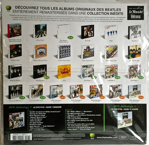 It’s part of a series produced by Universal Music in conjunction with the French newspaper Le Monde and their weekly art, TV and culture magazine Télérama. Starting back in January, each week they’ve slowly been releasing a collection of 25 Beatle albums and DVDs. As you can see these are individual CDs (or DVDs), each in a cardboard gatefold CD/DVD cover. This is attached for display purposes to a larger black cardboard square (11 inches by 11 inches). Each backing square has unique artwork and everything is sealed in a clear cellophane outer.