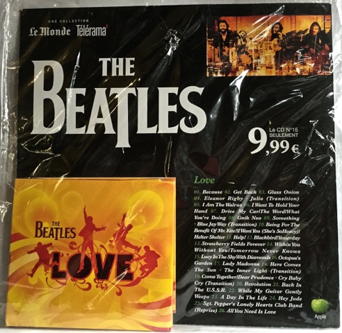 We’d pretty much given up all hope when we tried the very last kiosk we could find….and there we found it, hanging on a hook in the kiosk. It was a little beaten up (you can still see the hook hole) – but it was a copy of the single CD Love album in its unique French cardboard gatefold slipcase: