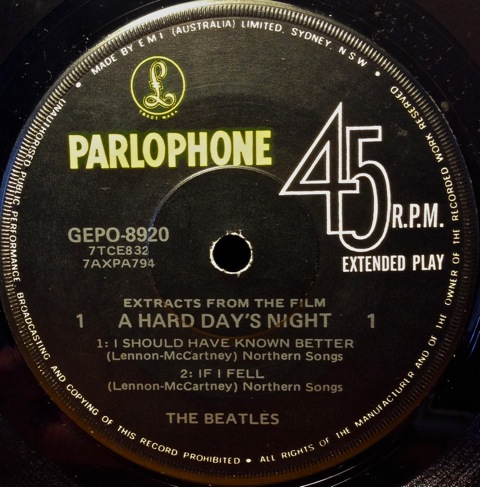 By the way, the framed gold record John has was for the US Capitol pressing of “I Want to Hold You Hand”. This is an original presentation white matte gold award. The single had sold over a million copies and was certified gold on February 3, 1964, just days before the band was to appear in New York at the start of their 1964 US tour. By March 28th Capitol Records reported sales in excess of 3.4 million copies. This and the following two singles are the extremely rare variety with the RIAA logo attached to the presentation plaque with glue. Only awards prepared before approximately September of 1964 use this format. Beginning in late 1964 the RIAA logo was etched into the presentation plaque. The plaque reads: Presented To The Beatles To Commemorate The Sale Of More Than One Million Copies Of The Capitol Records Pop Single Record “I Want To Hold Your Hand”. (Thanks to the whocollection site for the information):