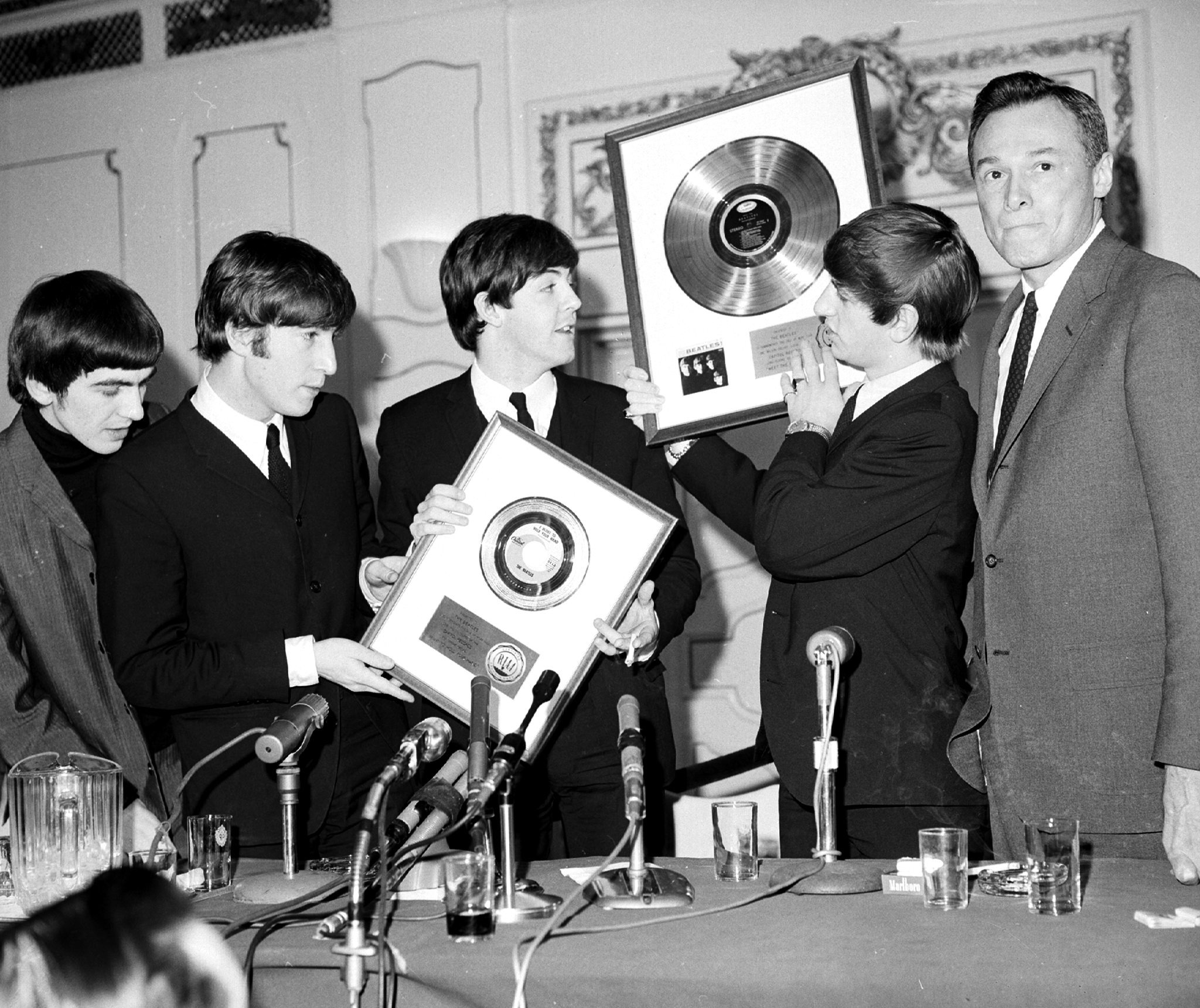 Here they are in the same suits they are wearing in the hotel room in the photos above accepting the gold record from Allen Livingston, President of Capital Records at the Hotel Plaza: