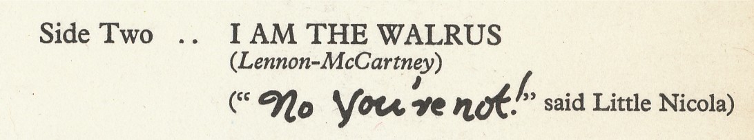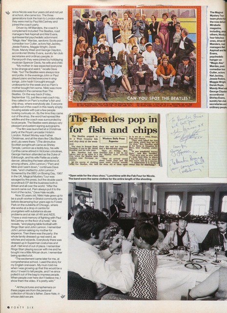 It’s a neat little four-page article and photo essay, a where are they now piece on the whereabouts of the little girl called Nicola who appears in the Beatles 1967 film “Magical Mystery Tour” and who is name-checked and immortalised on the track-listing on both the album and the original EP cover. You can see this in the printed title for the song “I Am the Walrus”, which has the hand-written subtitle (“No you’re not!” said Little Nicola):