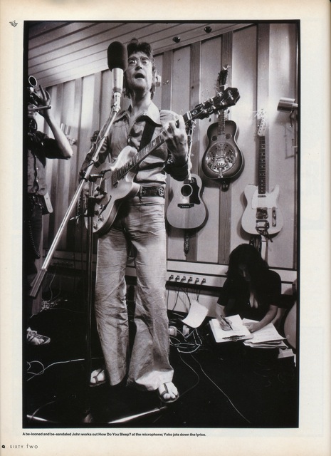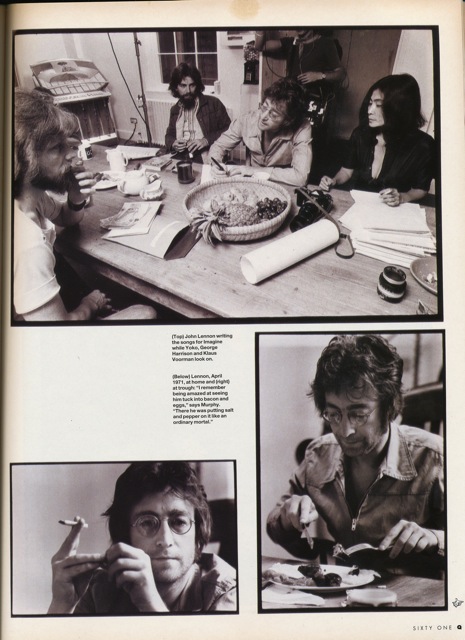 With great photographs throughout this article ranges over 10 pages. It features the reminiscences of a range of people including Andy Stephens who was a tape operator at EMI’s Abbey Road studios during the rush recording of the song “Instant Karma” in 1970. (We learn in the article that Stephens is now the manager of Susan Boyle!). He relates a revealing story of Lennon enjoying a rare moment of privacy at Abbey Road in 1970: