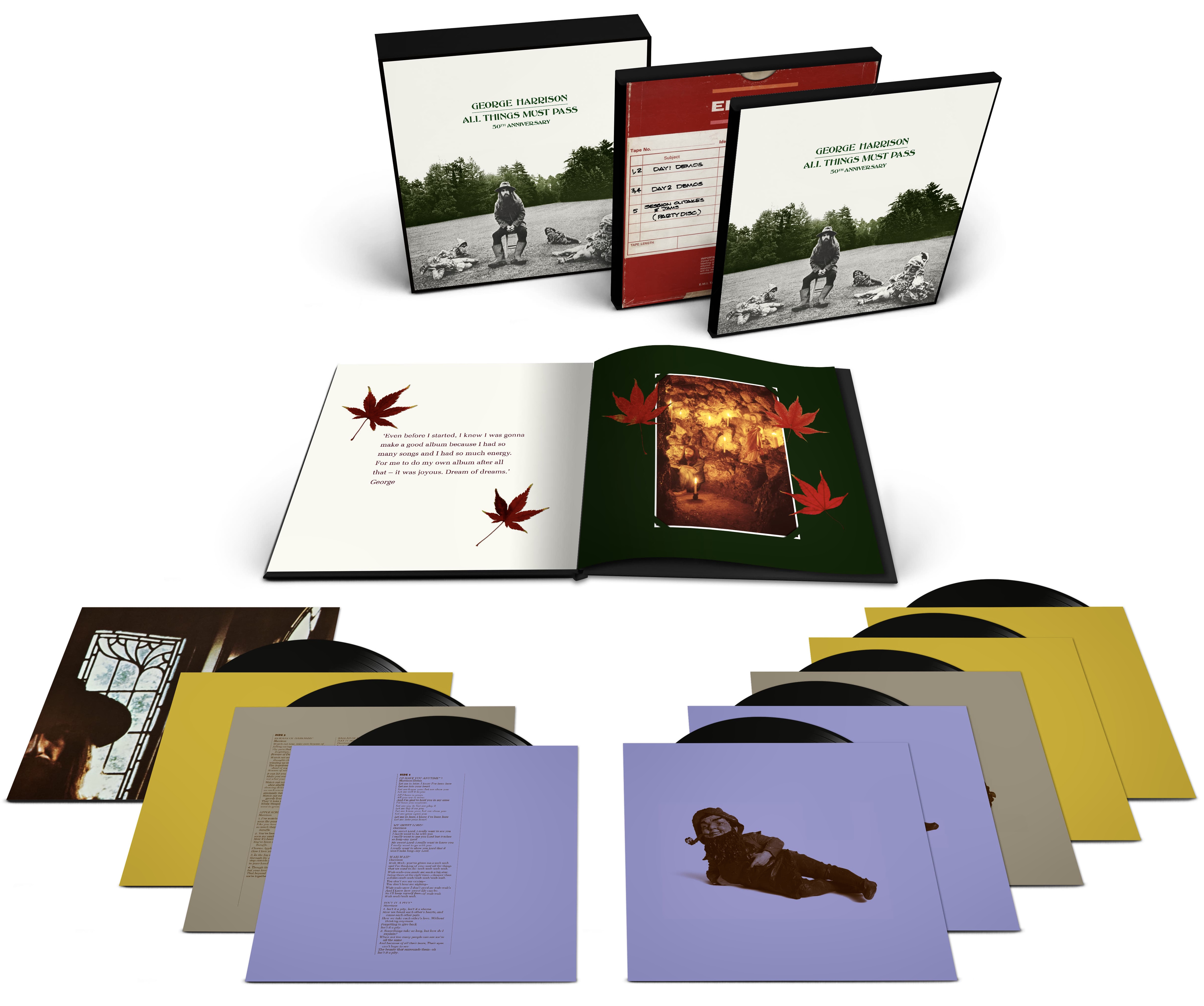 On Tuesday someone at the official George Harrison site stuffed up and, two days before the official announcement, accidently made public a couple of pages worth of information about the long-awaited All Things Must Pass 50th Anniversary box sets. This included images, prices, and content details.