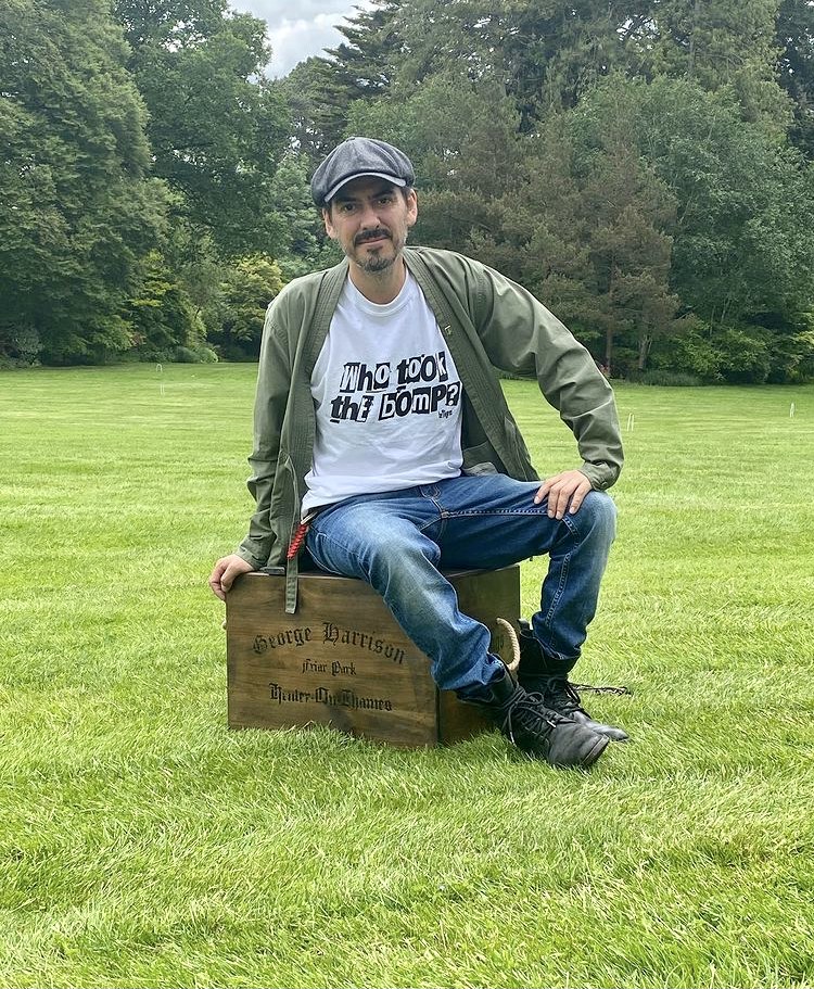 The wooden box is huge. The packshot image above doesn’t give an indication how big this thing is. Here’s an Instagram image of Dhani Harrison sitting on the Uber crate at Friar Park – in what looks like the exact same spot the famous All Things Must Pass cover shot was taken: