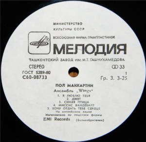 There is one other in my collection. Its Paul McCartney – “Flowers in the Dirt” (1989). This is on the white Melodiya label and has a plastic inner bag: