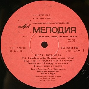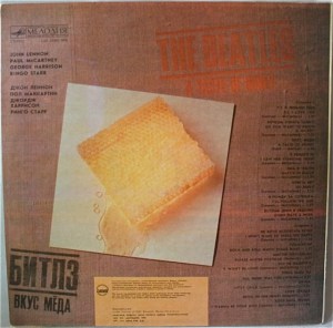 The final Russian Beatles pressing I have is a unique compilation of early material called “A Taste of Honey” (1986). It is on the Melodiya label (and there’s also an EMI logo on the front cover). This is another “Direct Metal Mastered” pressing and it has an official DMM logo on the rear cover. Its in a single sleeve and a plain white inner bag: