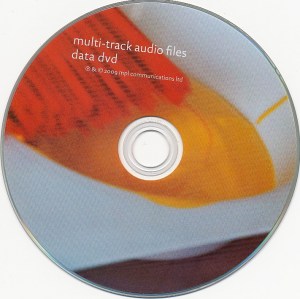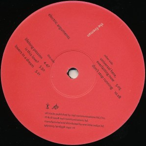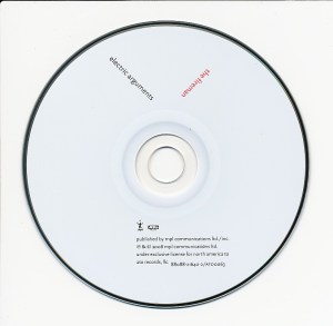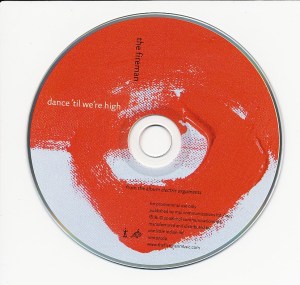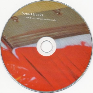 The Cover: This, like all The Fireman releases so far, is an interesting example of design. It’s a triple-fold cardboard “sleeve” which wraps around the disc and is held together by a custom-made red elastic band. Unusual. No designer is credited, but it seems that Norman Hathaway (who did the extensive artwork for the “Electric Arguments” project) was involved. The colours used throughout the design have common themes and elements taken from the “Rushes” CD and LP covers. The vinyl disc has custom labels: